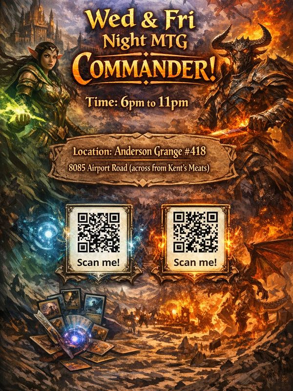 Come on down every Wednesday of the month and the 1st, 3rd, & 4th Friday of every month and play Magic The Gathering! 6pm-11pm